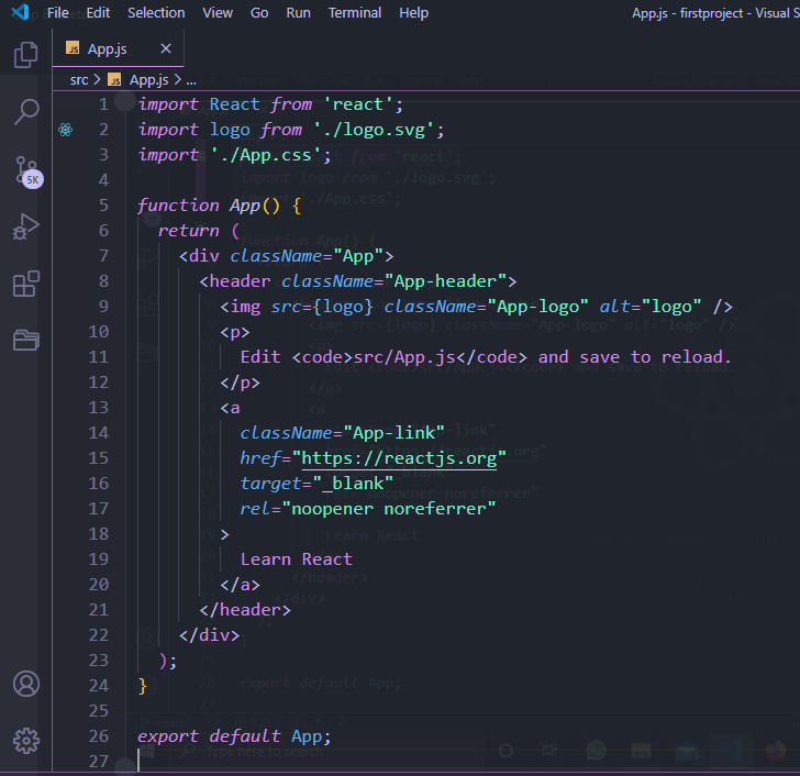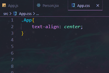 و حالا اگر بخایم به این نوشته استایل بدیم و بطور مثال اون رو وسط چین کنیم ، به دایوی که داخل jsx فایل app.js هست “className=”App رو قرار میدیم (همونجور که گفته شد فایل jsx یک فایل html نیست که برای کلاس دهی از خود کلمه ی class استفاده کنیم و خود کلمه ی class رزو شده ست پس نمیتونیم ازش استفاده کنیم. ) به عکس های زیر توجه کنین: