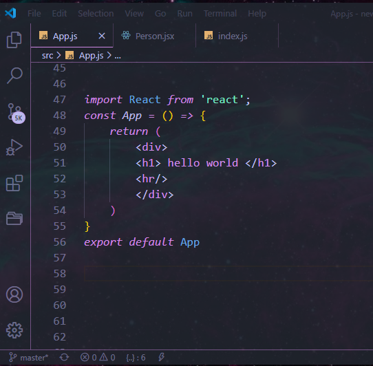 همونجور که میبینین هرچیزی که مابین return بود رو پاک کردیم و داخل یک دایو پیغام مورد نظرمون رو گذاشتیم . به کد های مابین اون jsx گفته میشه که مخفف javascript xml هست که به نظر میرسه html باشه اما نیست و وقتی بخایم توی این قسمت از کد جاوا اسکریپت استفاده کنیم باید اون رو بین یک {} قرار بدیم که البته باید single line باشه.