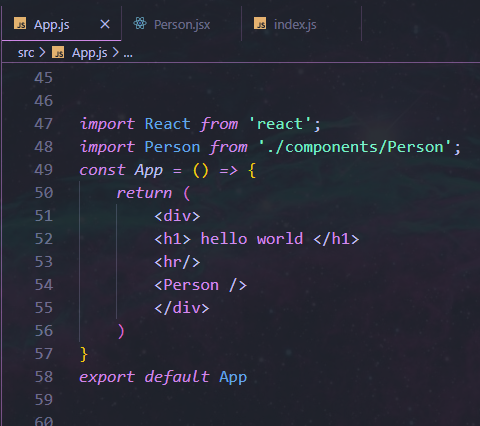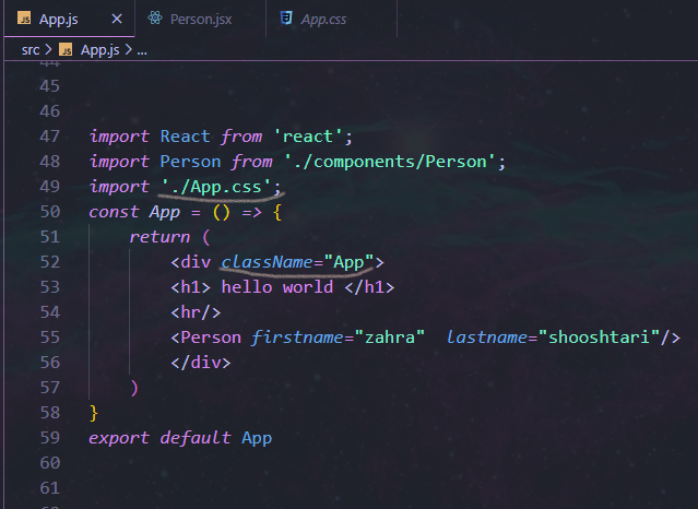و میایم داخل فایل App.js که کامپوننت اصلی ما هست ، کامپوننت جدیدمون که Person.jsx هست رو ایمپورت میکنیم و داخل اون </Person> رو قرار میدیم :
