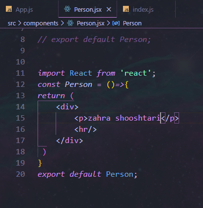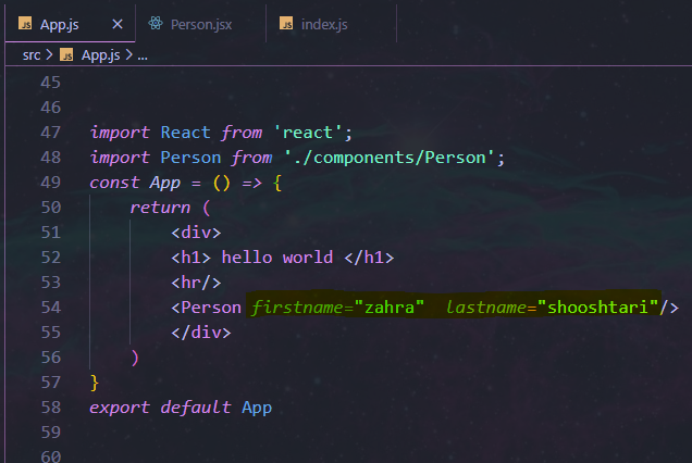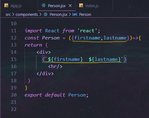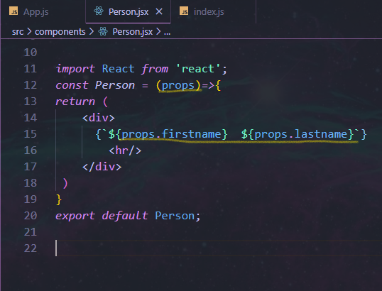 همون طور که میبینین اتریبیوت مورد نظر هایلایت شده. ما دو اتریبیوت firstname و lastname رو به props دادیم. و این هم خود کامپوننت Person: