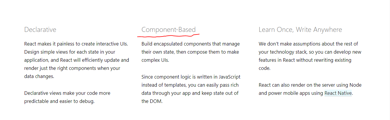 همان طور که مشاهده می کنید یکی از ویژگی های ری اکت Component Based بودن آن است که مفهومش بالاتر توضیح داده شد.