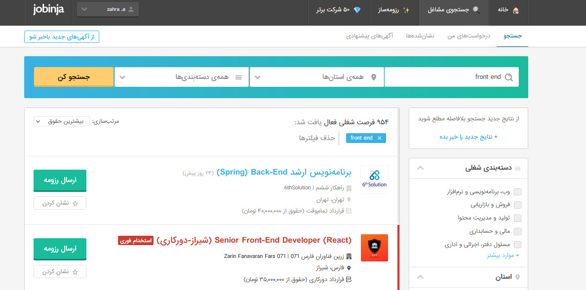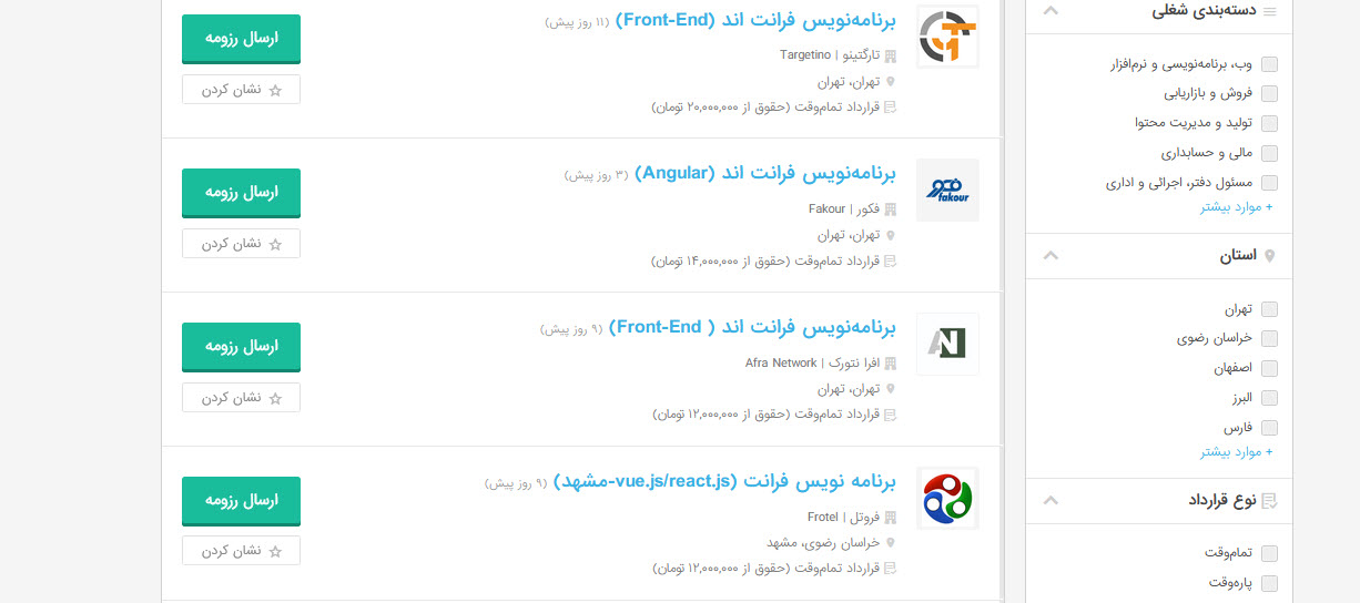 همون طور که تو عکس مشاهده می کنین، 954 تا آگهی شغلی فقط تو جابینجا واسه فرانت اند وجود داره!! یعنی به همین اندازه بازار کار خوب و فوق العاده ای داره و اگه شما بتونین یک متخصص فرانت اند بشین، قطعا می تونین درآمد های خیلی خوبی داشته باشین.