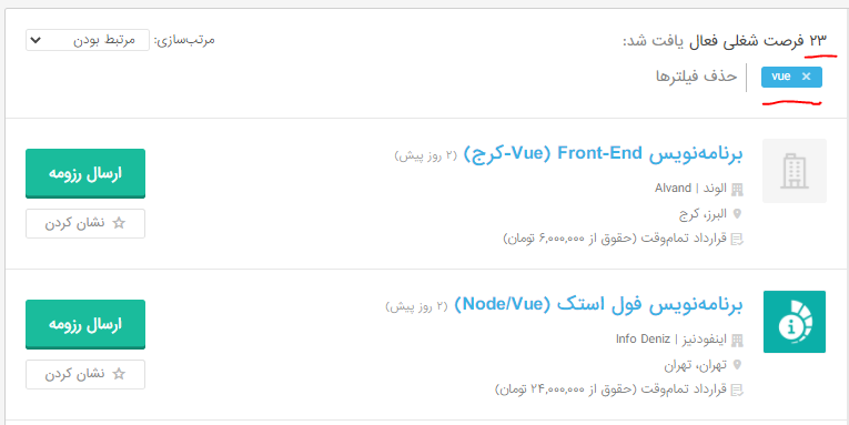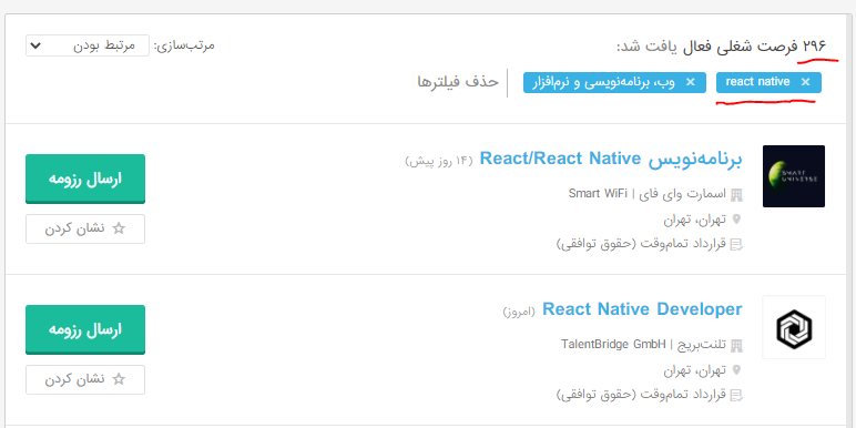 همان طور که مشاهده می کنید، بنا به آمار و تعداد آگهی های استخدام موجود در سایت جابینجا 296 آگهی استخدام برای ری اکت، 23 تا برای ویو و 126 تا برای فریمورک انگیولار وجود دارد.